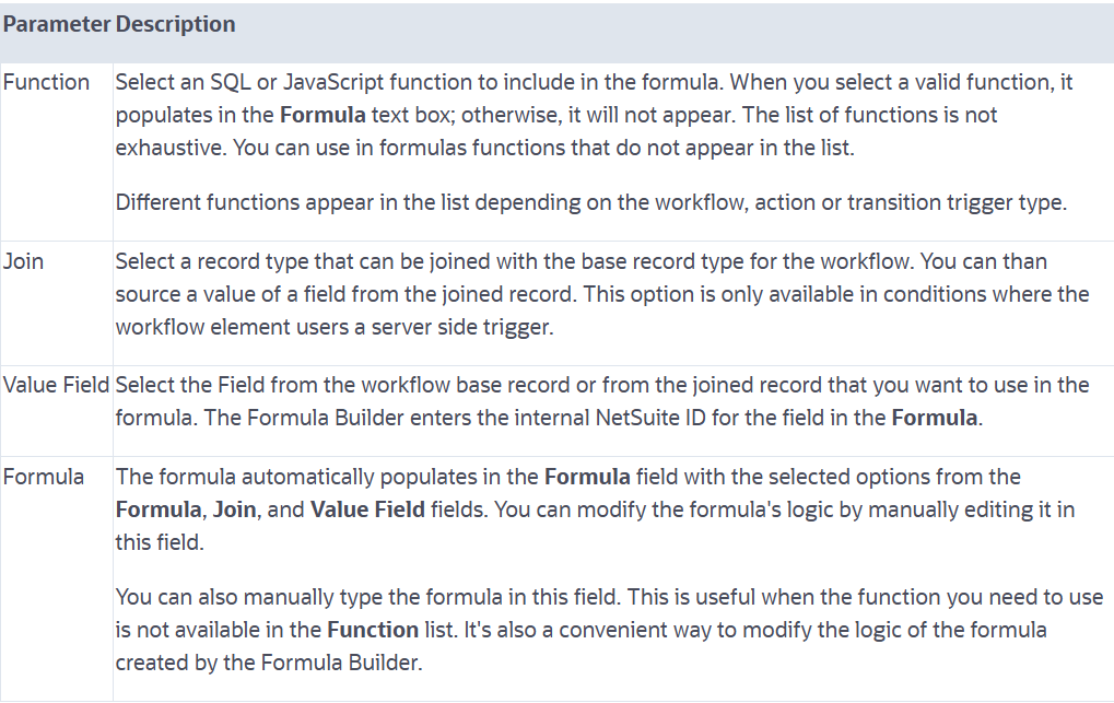 We can use the Formula Builder to define conditions with formulas. Formulas are evaluated at the time a workflow triggers or an action or transition executes. Formula definitions can include internal field IDs, SQL functions, JavaScript, SuiteScript, and mathematical operators. We can manually enter formulas or develop them using the Formula Builder.