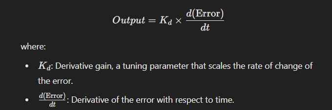 - Rate of Change of Error: The D Controller calculates the derivative of the error, i.e., how fast the error is changing over time. This rate of change is then multiplied by a constant, known as the derivative gain (Kd), to produce the controller output.