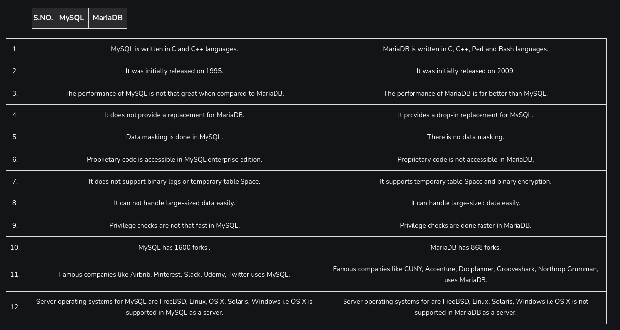 MariaDB is an open source relational database management system (RDBMS) that is a compatible drop-in replacement for the widely used MySQL database technology. It is developed by MariaDB Foundation and initially released on 29 October 2009. MariaDB has a significantly high number of new features, which makes it better in terms of performance and user-orientation than MySQL.