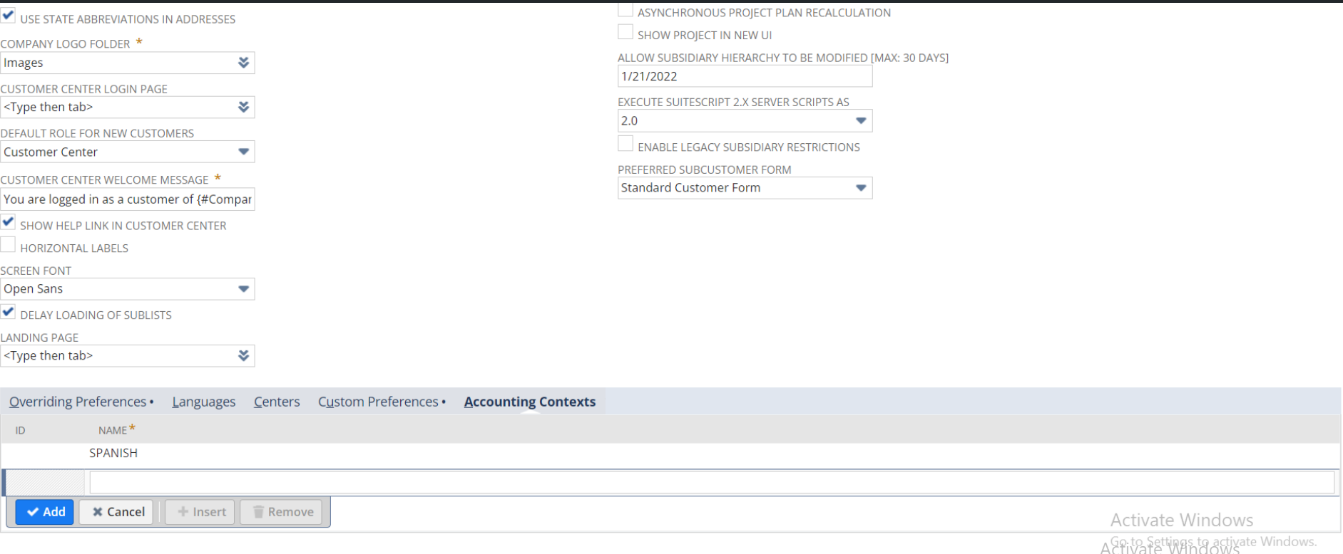 - In General Preference, under Accounting Context, create new context