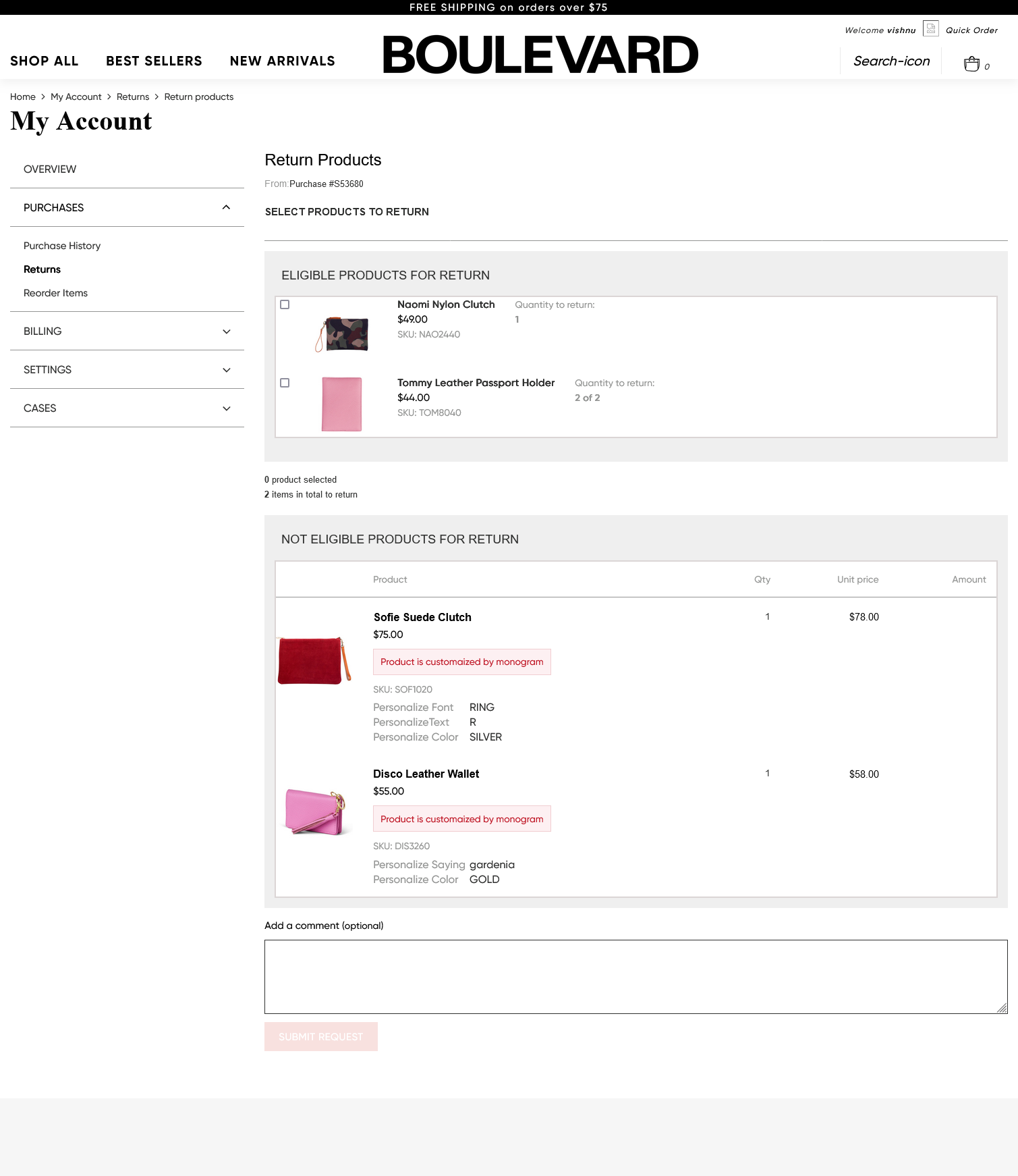 Description: We can use this solution to show the products as ‘Eligible for Return’ or ‘Not Eligible for Return’ with custom conditions like personalized product and order date. and made customers only return eligible items.
