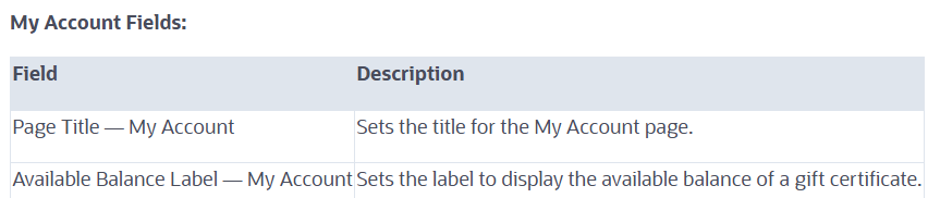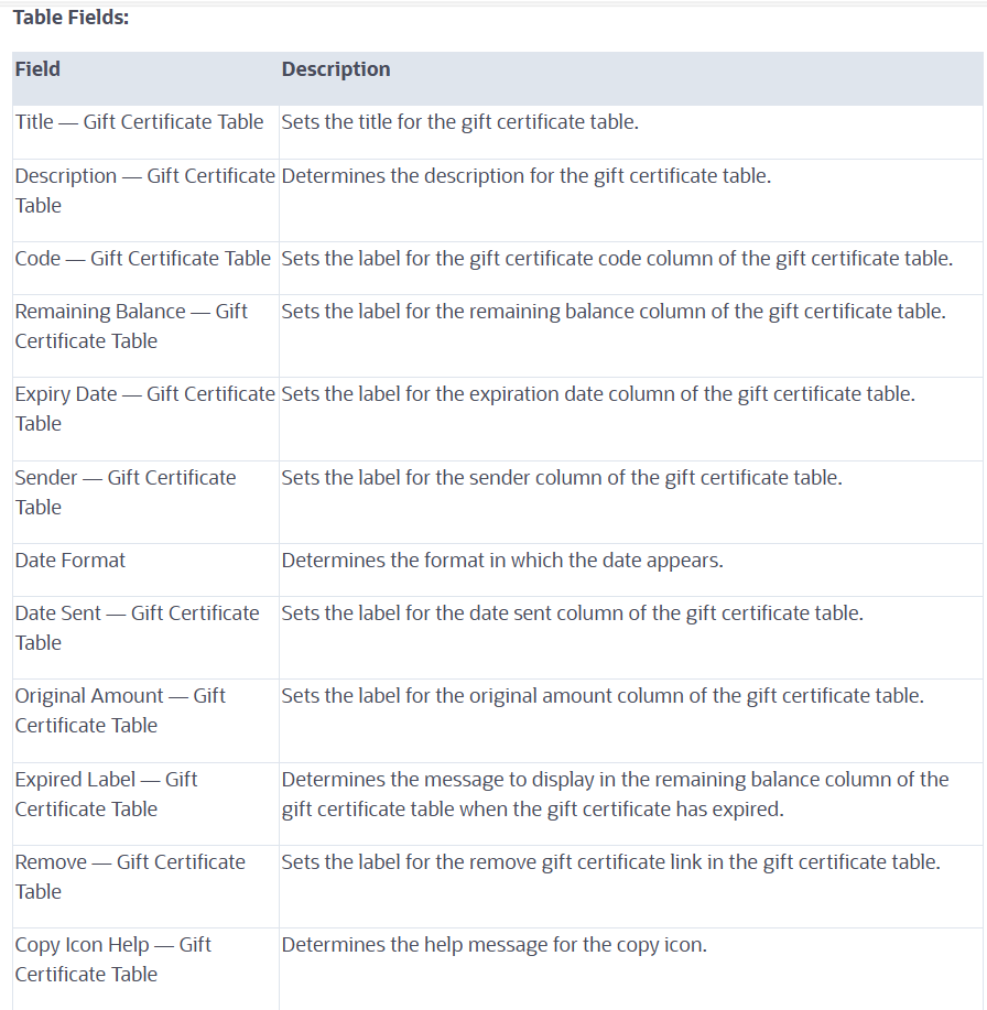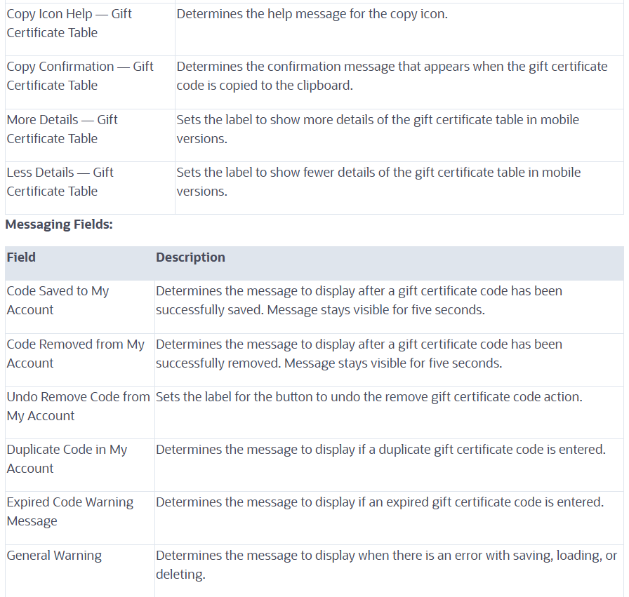 Use the SC Configuration record to enable gift certificate value check and storage on the My Account page. You can determine the feedback messages and appearance of the Gift Certificate Table in My Account.