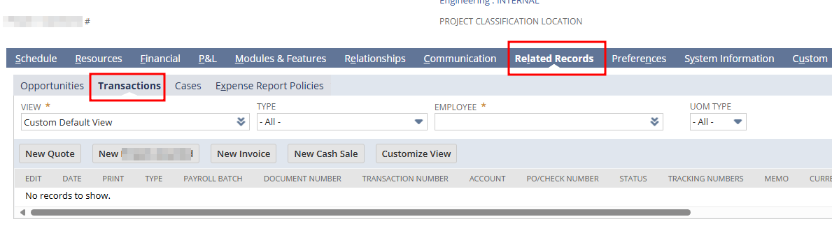 For a custom project manager role, in the project record, under the related records tab, the Transaction subtab is missing.