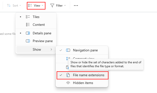 - Ensure that the File name extensions checkbox is checked. This will allow you to see the file extension next to the report name.