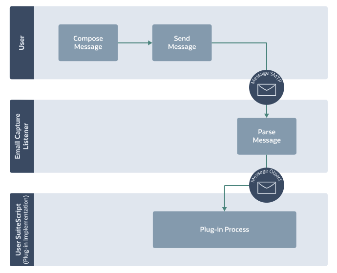 • The message was received by NetSuite. NetSuite routes it to the appropriate plug-in implementation as an object. We can have multiple Email Capture Plug-in implementations active in a single account.