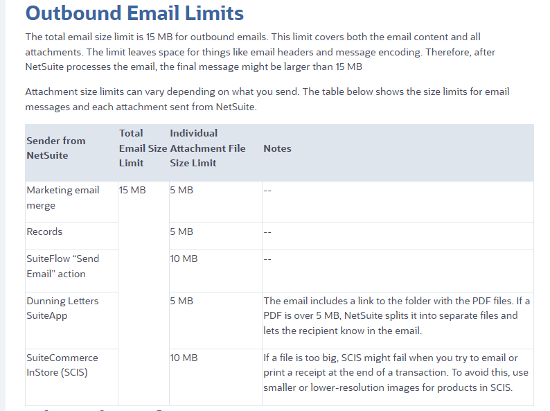 Attachment size limits can vary depending on what you send. The table below shows the size limits for email messages and each attachment sent from NetSuite.