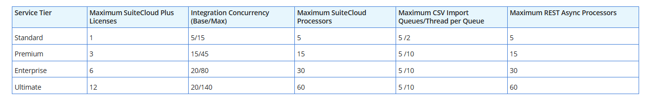 The table below highlights the improvements attainable through SuiteCloud Plus licenses, depending on the service tier: