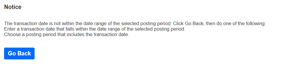 “The transaction date is not within the date range of the selected posting period. Click Go Back, then do one of the following:
