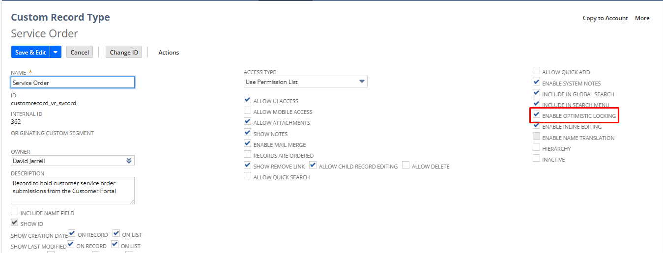 The Enable Optimistic Locking option is enabled by default for all custom record types created as of 2012.2 and later. For backward compatibility, this option is disabled by default for custom record types created prior to 2012.2. You should enable this option but first review any scripts that may be affected by this change and edit them as needed.