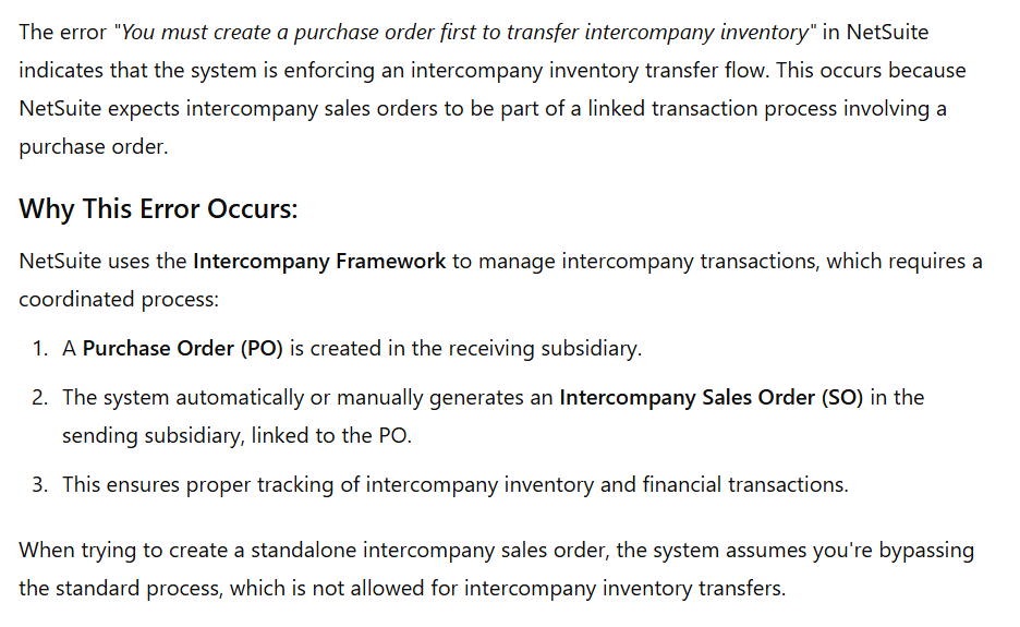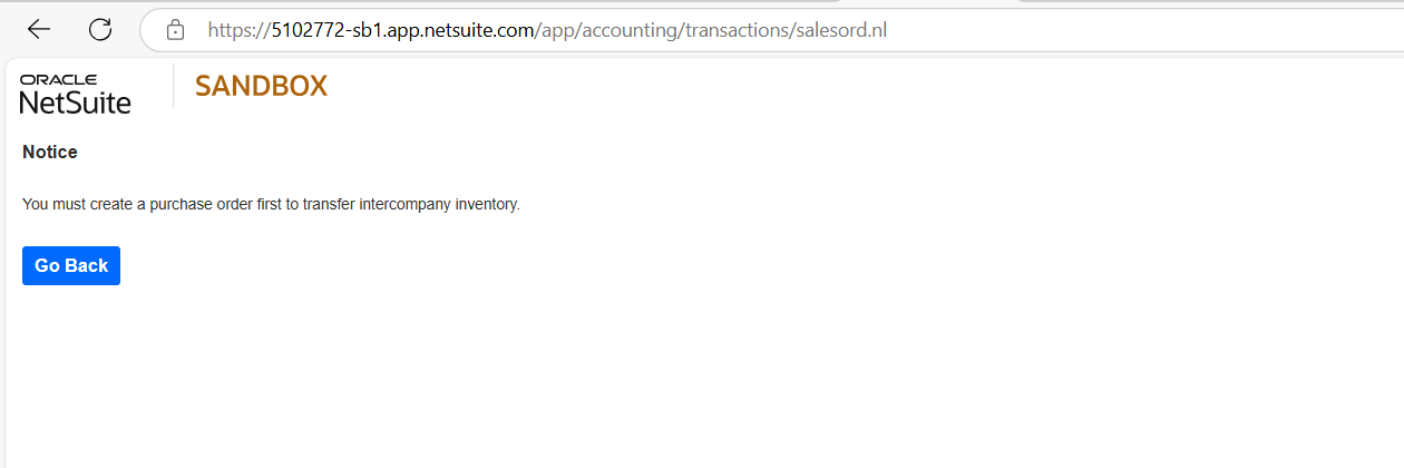 Error when creating transactions “You must first create a purchase order to transfer intercompany inventory” Error displayed while creating standalone sales order for intercompany customer Reason: