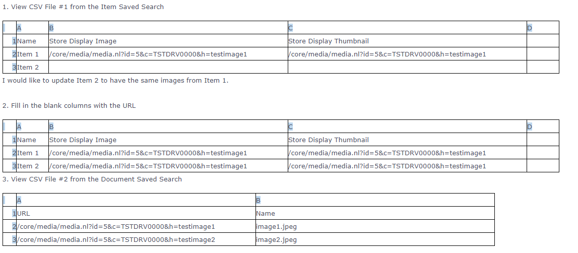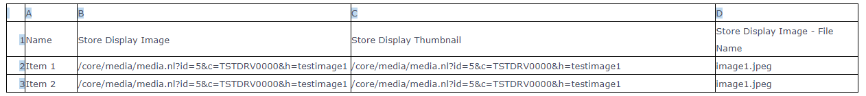 3. Modify the CSV File and assign image URL from File Cabinet to Item Display Image and Item Display Thumbnail columns