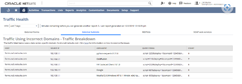 - After you have updated all of the external Suitelets listed in the original report, generate a fresh report to validate there are no external Suitelets in your account that are using data center-specific domains.
