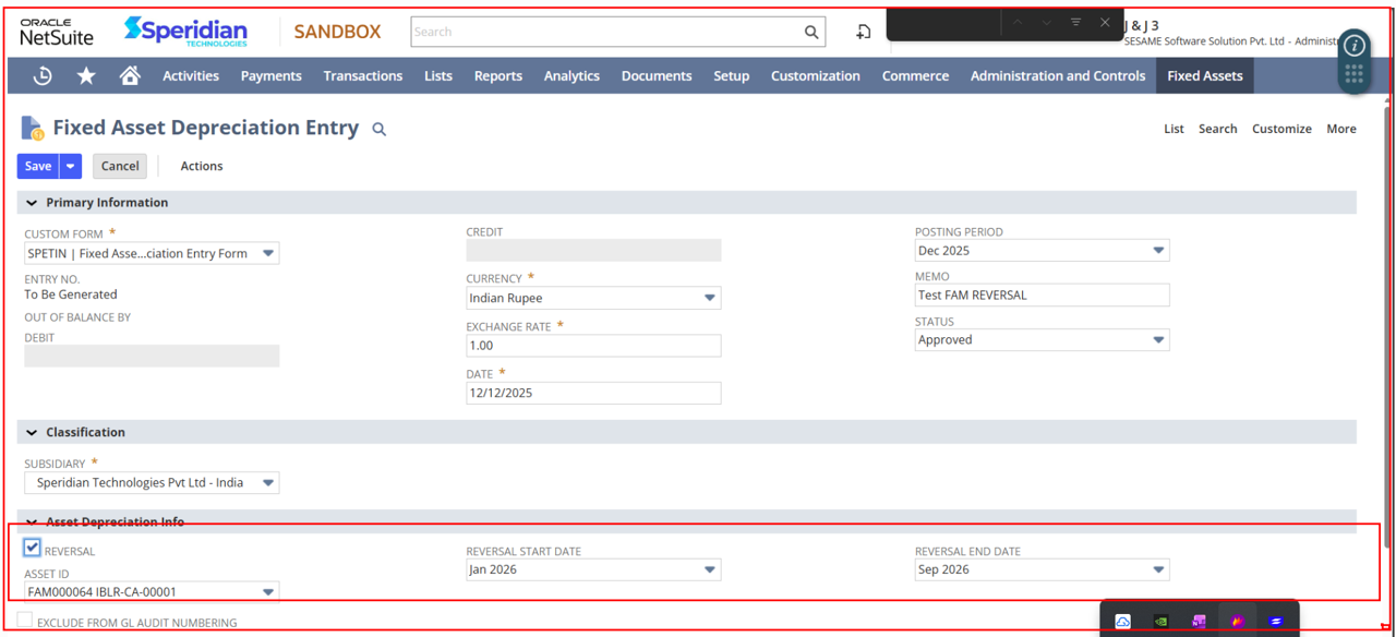 Solution Given: We have added some mandatory fields in the depreciation JE in the fam module for reversal attaching the SS