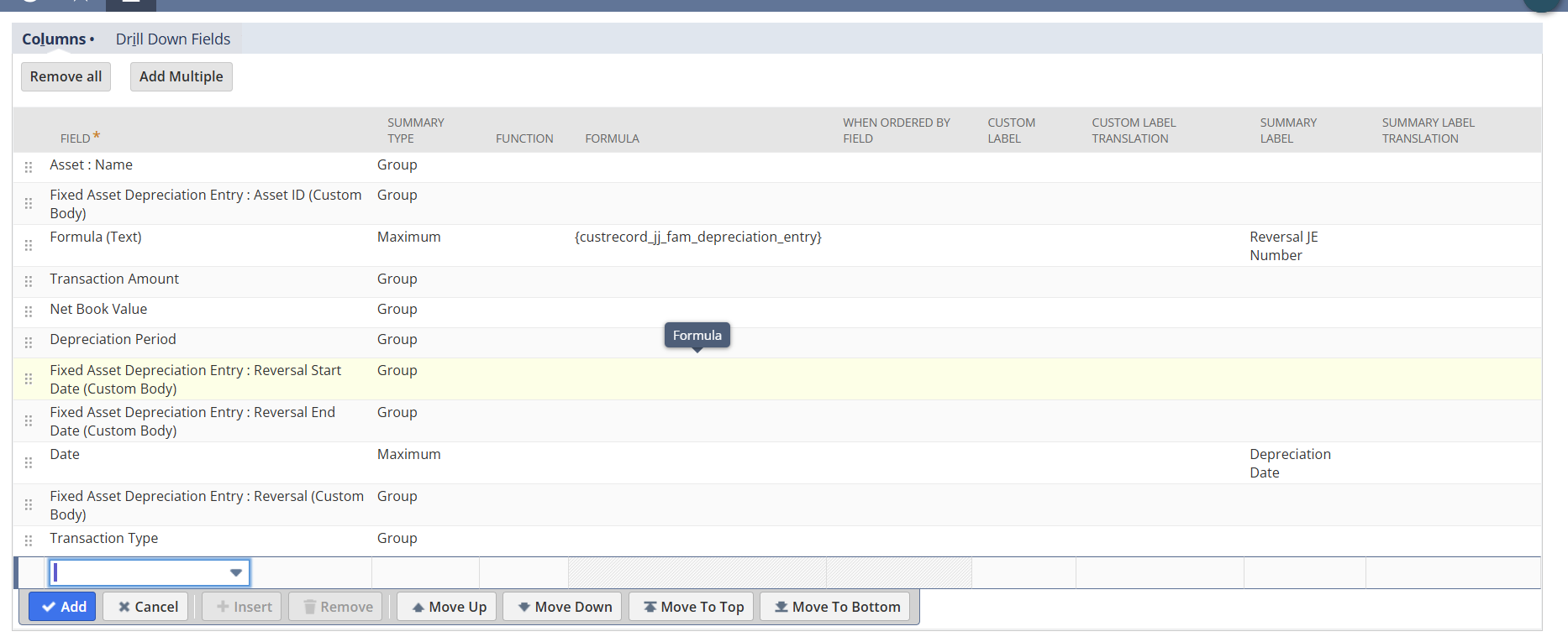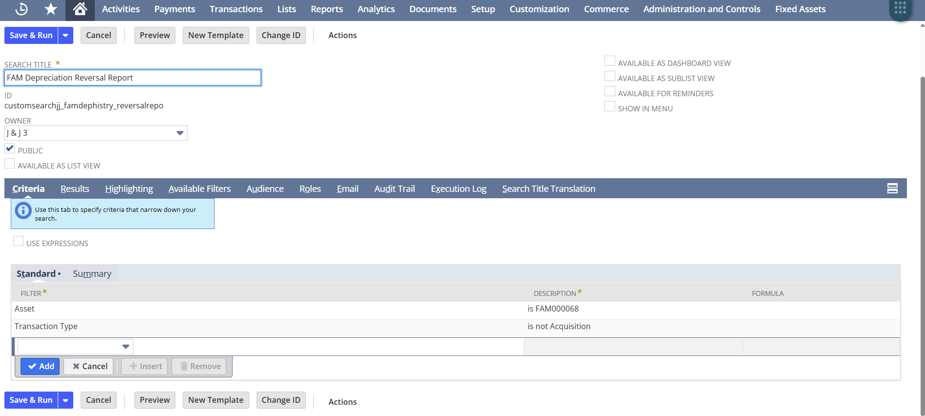 Client needs to fill these fields while creating reversal JE . Once the record is saved the same Je number will be displayed on the depreciation history of the reversed JE. Based on this depreciation history we have cred a Saved search