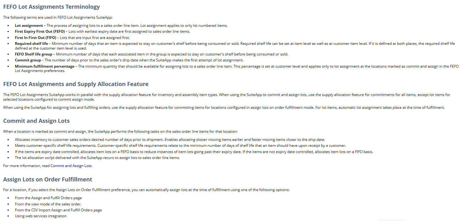 The FEFO (First Expiry First Out) Lot Assignments SuiteApp manages the process of optimal lot assignment to sales order line items. The lot assignment happens either on a first expiry first out (FEFO) or a first in first out (FIFO) basis. If the item is expiry date controlled, the assignment takes place on FEFO basis, else on FIFO basis.