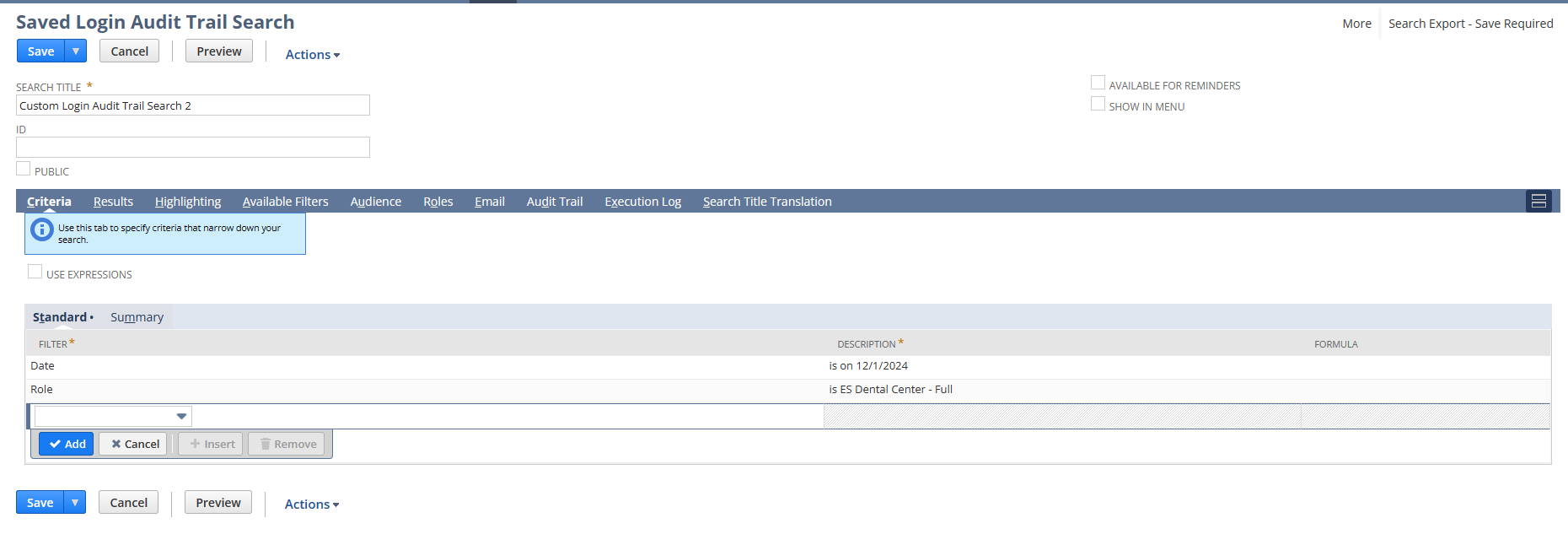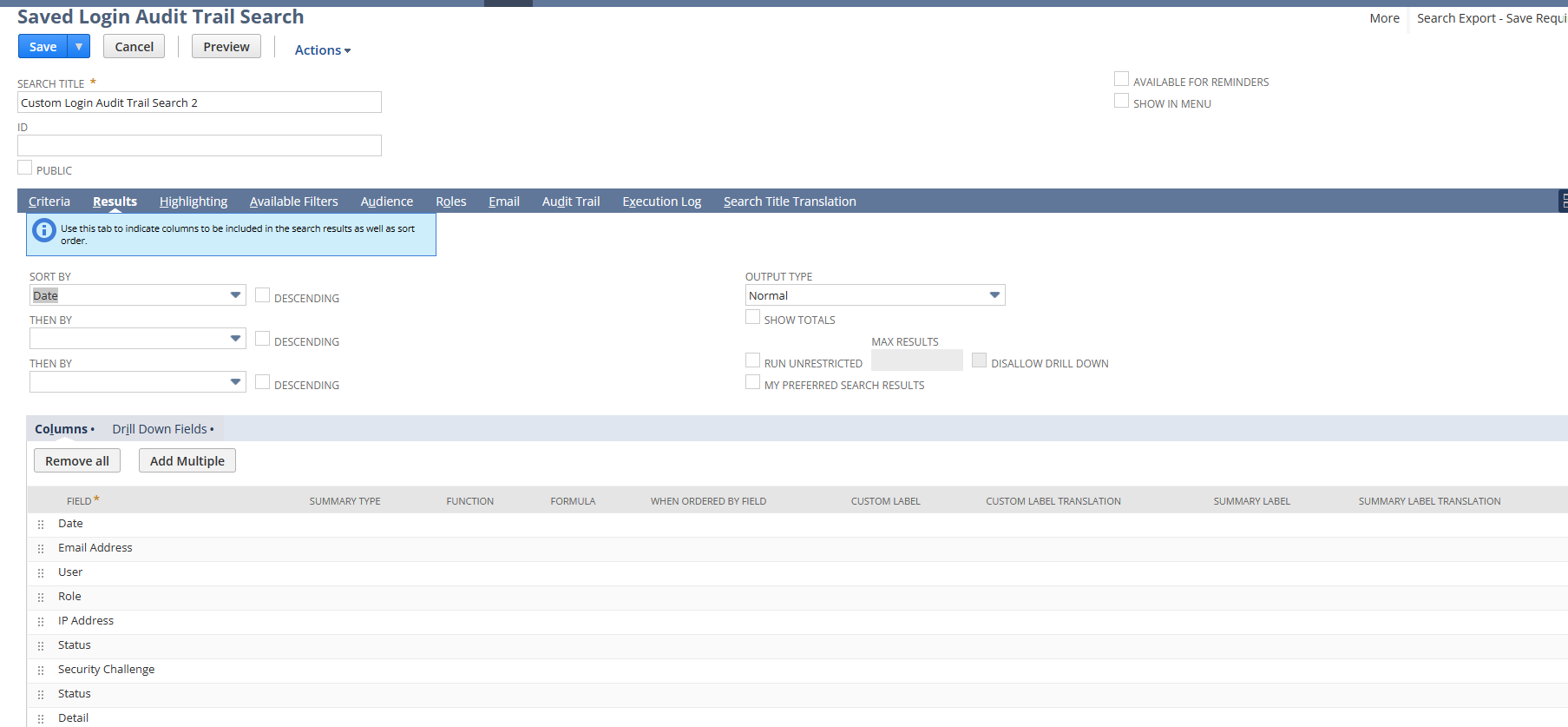 - Available results fields include: Date, Email Address, formulas, IP Address, Request URI, Role, Security Challenge, Status, User, User Agent, Employee fields, Role fields, token-based Authentication fields (Detail, Token-based Access Token Name, Token-based Application Name) and in some cases Customer, Partner, and/or Vendor fields.