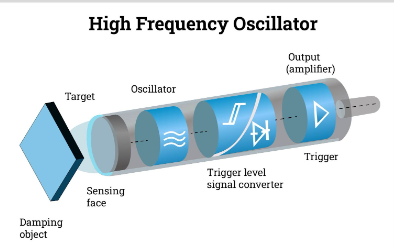 - An electromagnetic field with a high frequency is produced by the oscillator and is emitted from the switch’s sensing face. Eddy currents are generated inside conductive metal when it meets this electromagnetic field, changing the oscillations’ amplitude. The outcome is a voltage change at the oscillator’s output, which modifies the trigger’s state and the output state.