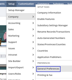 In previous articles, we covered the topics of Company setup and Account setup. Now, we will set up the general preferences for the company account. This setup includes defining important preferences for your company that NetSuite will use across many modules and features. To select these general preferences, follow the navigation path: Setup > Company > Preferences > General Preferences.