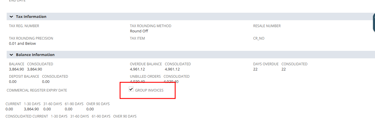 2) check the ‘Group Invoice ‘ checkbox for the customer in the financial sub tab