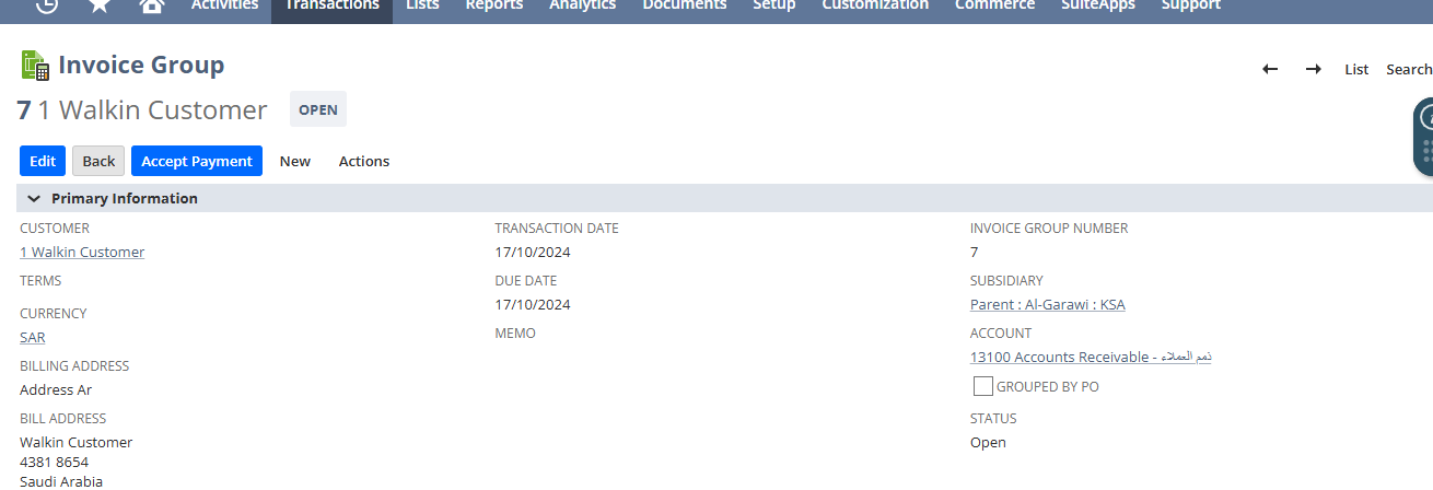 In the sales orders of the customers when items are partially fulfilled, and then separate invoices are created for these fulfilments the standard feature of NetSuite allows us to group the invoices into a single invoice called Group Invoice.