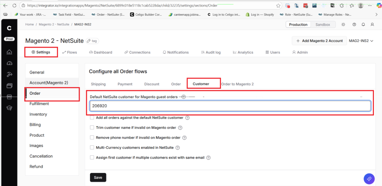 In the Celigo Magento → NetSuite customer/order sync flow, guest checkout orders can cause customer creation or mapping issues if the flow is not configured according to business requirements.