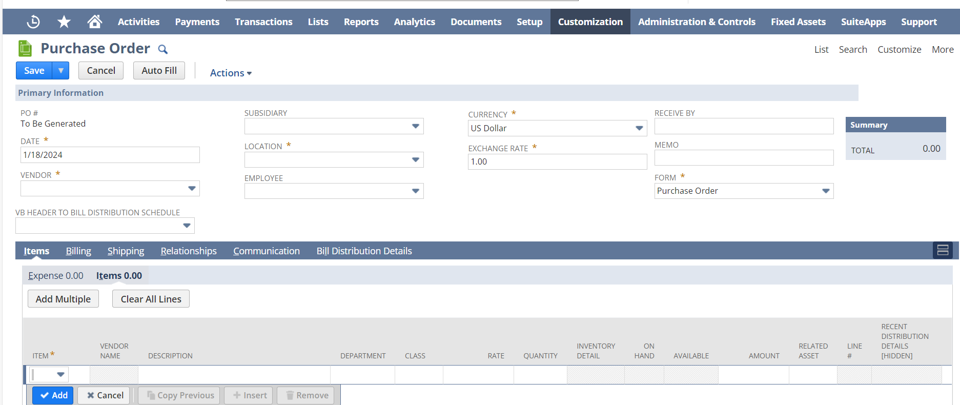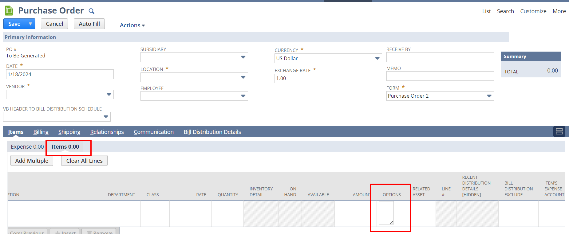 The options field is available as a sublist field in transactions like the purchase order. This field is from the feature ‘Item Options’ in ‘Enable features’.