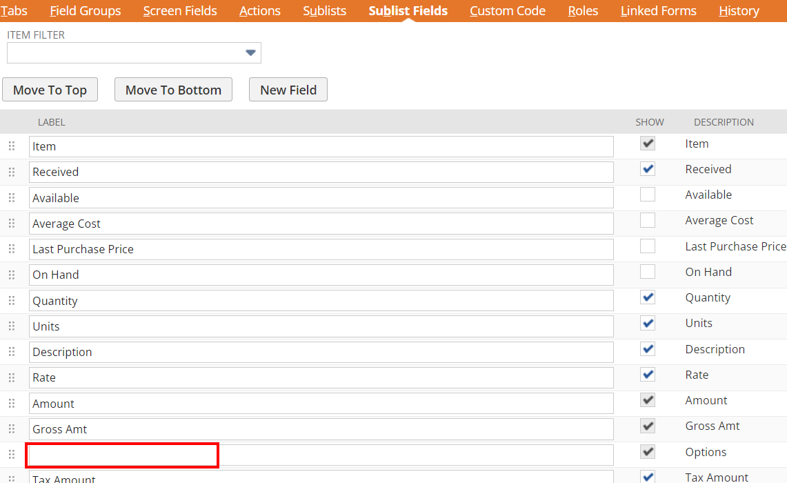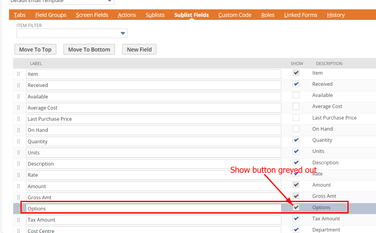 The Options sublist field in the Purchase Order will by standard have the ‘Show’ button in the PO form greyed out. Hence, we cannot hide the same by unchecking the button.