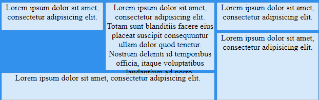 <div class="grid-container"> <div class="item1"><p>Lorem ipsum dolor sit amet, consectetur adipisicing elit.</p></div> <div class="item2"><p>Lorem ipsum dolor sit amet, consectetur adipisicing elit. Totam sunt blanditiis facere eius placeat suscipit consequuntur ullam dolor quod tenetur. Nostrum deleniti id temporibus officia, itaque voluptatibus laudantium ad porro.</p></div> <div class="item3"><p>Lorem ipsum dolor sit amet, consectetur adipisicing elit.</p></div> <div class="item4"><p>Lorem ipsum dolor sit amet, consectetur adipisicing elit.</p></div> <div class="item5"><p>Lorem ipsum dolor sit amet, consectetur adipisicing elit.</p></div> </div>
