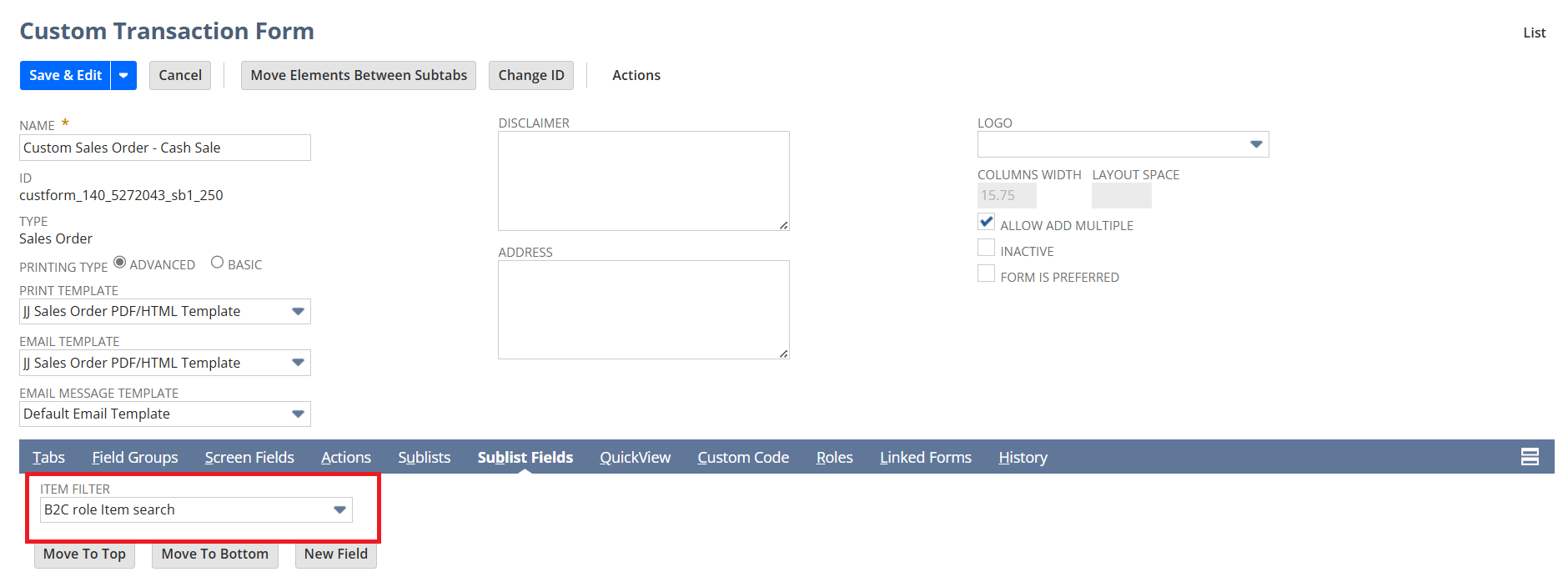 - Add the saved search to the item filter field under the sublist fields section of any custom transaction form.