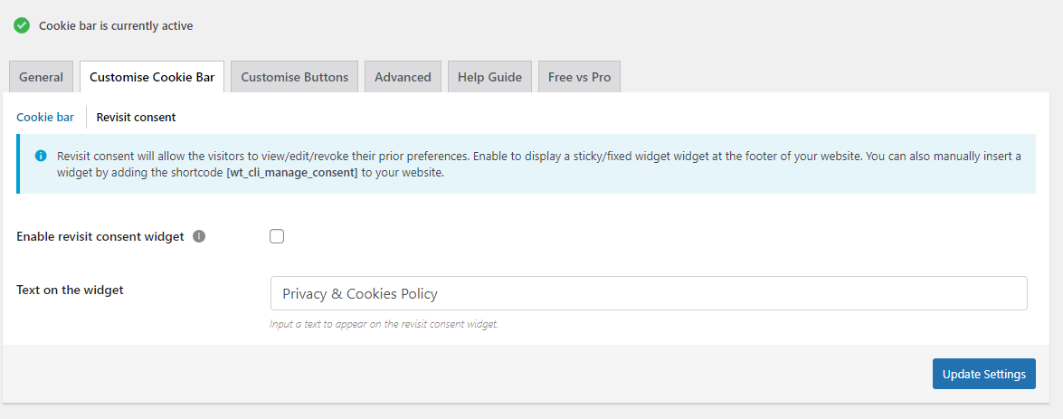 - For disabling this option, go to GDPR Cookie Consent → settings → Customize Cookie Bar → Revisit Consent (Tab) → uncheck Enable consent Widget .