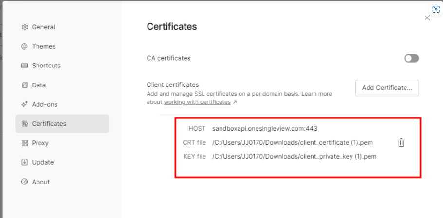 How to upload a Client Certificate in Postman? To Upload a SSL Certificate in Postman: Go to Settings > Settings > Certificates. Click Add Certificate button. Add Host Upload CRT file from your local system. Upload Key file from your local system.