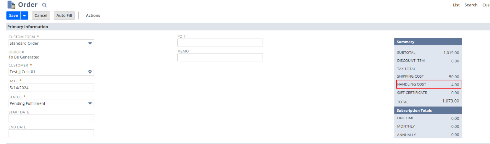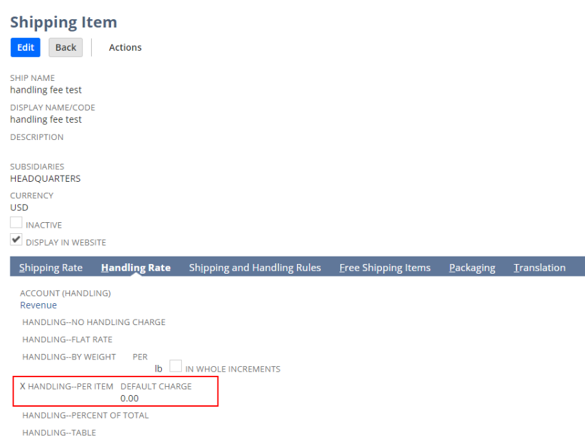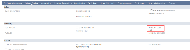 • Open the item record and look for a field labeled Handling Cost under the subtab “Sales/Pricing”.