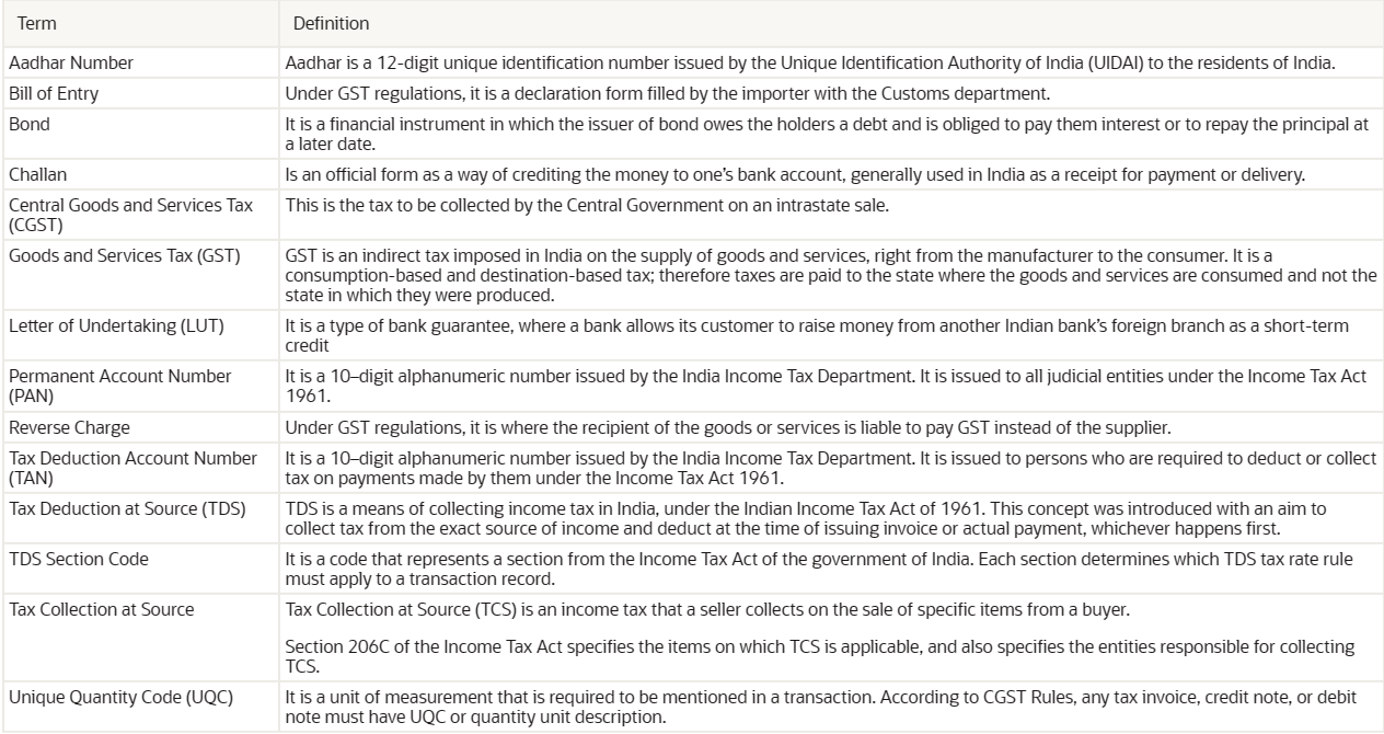 India Terminology In NetSuite The following table defines the terms used in NetSuite to support India-specific business processes and SuiteApps.