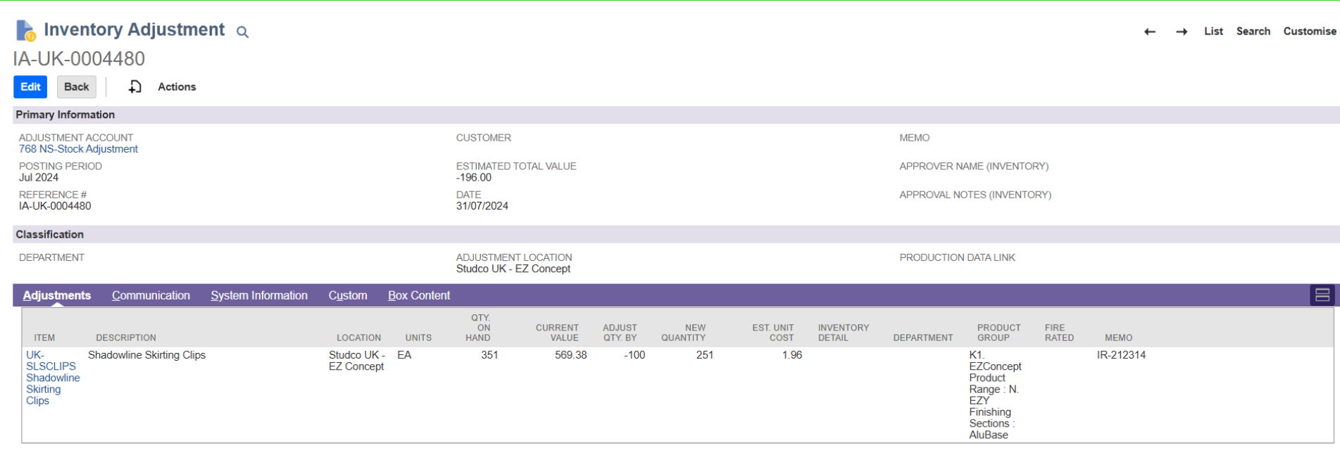 The Adjust Inventory form enables you to change the quantity and value of an inventory item without entering a purchase order.