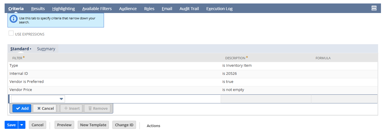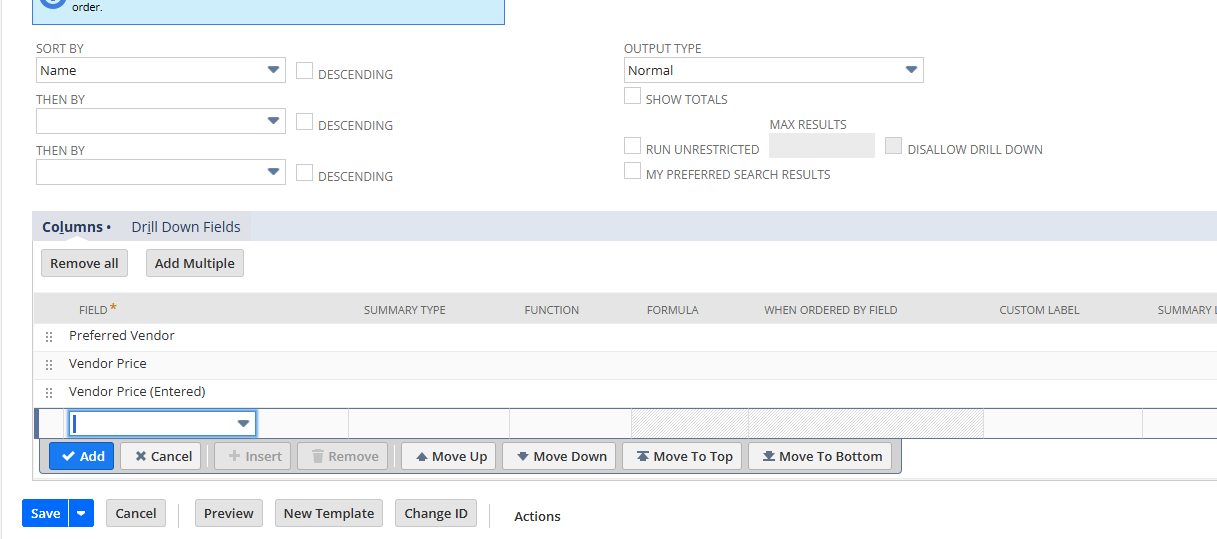 Item Saved Search that will display the Item’s Preferred Vendor and the Vendor Price.