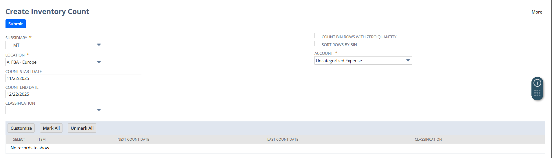 We need to set the “Next Inventory Count Date” for each item location in order to make the item available in the Create Inventory Count list.