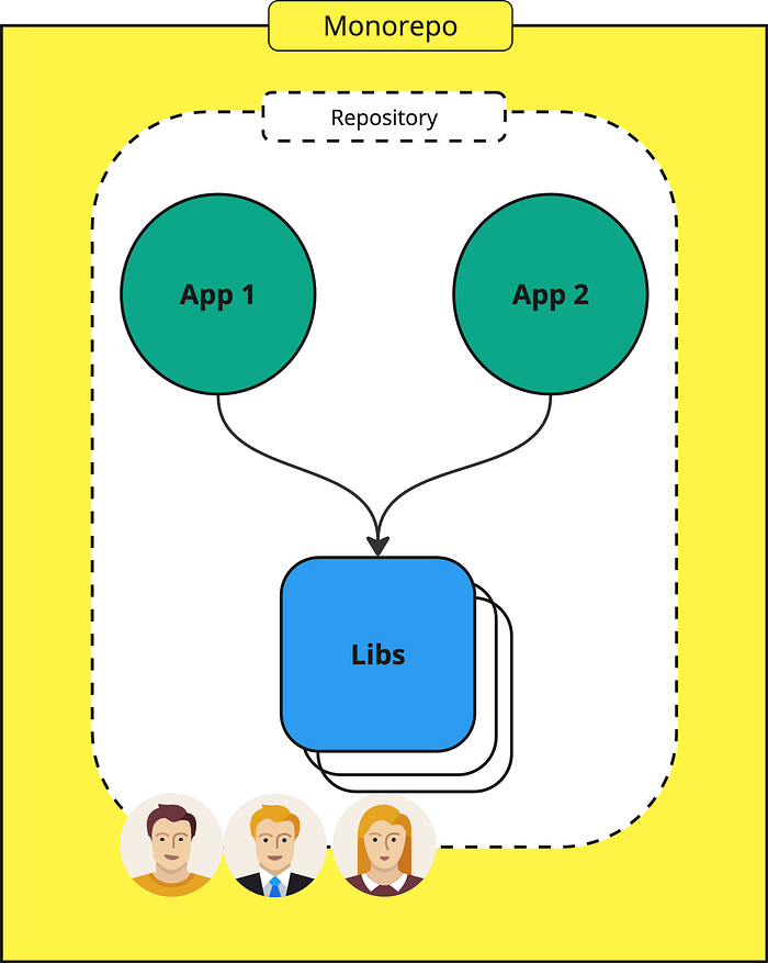 A monorepo hosts two types of projects: libraries and apps. Libraries are reusable pieces of code that are shared across multiple apps, while apps are standalone projects that use these libraries (and other dependencies). “Apps” in this context can be anything from a microservice to a micro frontend to a full-stack application.