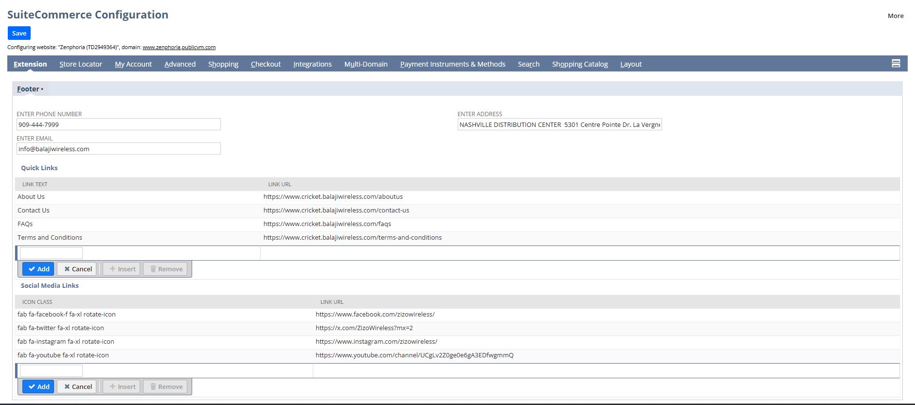 The above provided JSON configuration file will create ‘Extension’ tab, ‘Footer’ subtab, ‘Phone Number’ field, ‘Email’ field, ‘Address’ field, ‘Quick Links’ sublist and ‘Social Media Links’ sublist in the Suitecommerce configuration record.