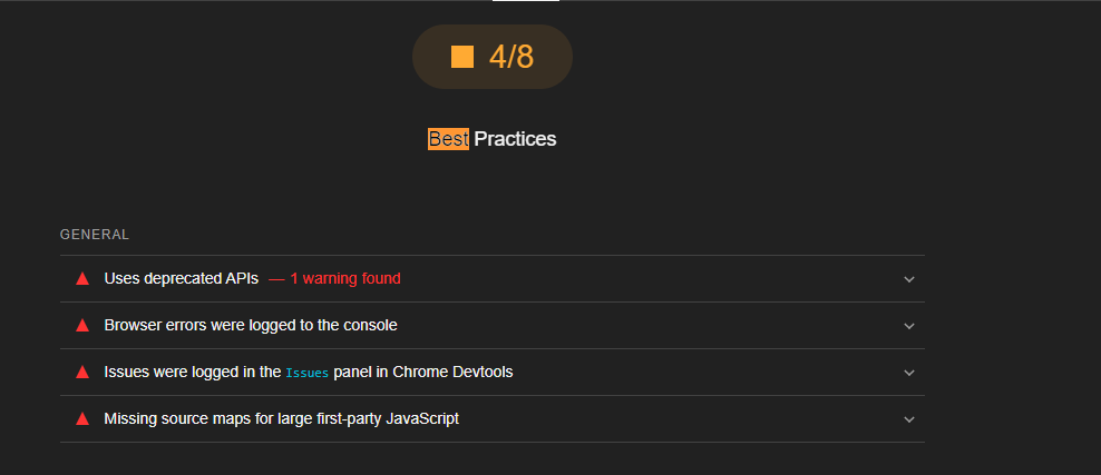 Apart from the performance results the best practices sections are shown, which helps the developers to optimize the page.