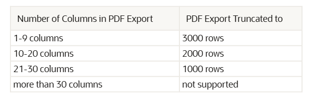To avoid performance problems, exports with more than 30 columns are not supported. Exports with more than 10 columns are truncated to a limited number of rows, as shown in the following table: