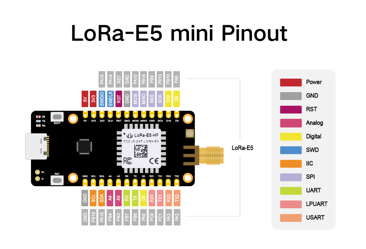 Wio-E5 mini leads out all GPIOs of Wio-E5, including UART, ADC, SPI, IIC, and etc. It contains RESET and BOOT buttons and is use-friendly. Supporting LoRaWAN® protocol, Wio-E5 mini features ultra-long-range transmission and ultra-low power consumption: it can achieve a transmission range of up to 10 km, and the sleep current of Wio-E5 modules on board is as low as 2.1 uA(WOR mode). It is designed with industrial standards with a wide working temperature at -40 ℃ ~ 85℃, high sensitivity between -116.5dBm ~ -136 dBm, and RF output power up to +20.8 dBm at 3.3V.