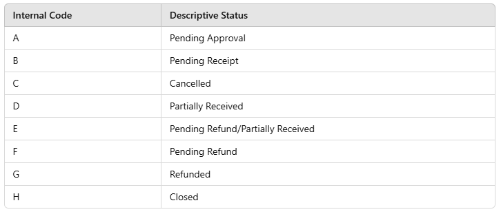 The table below shows the internal status codes and their corresponding descriptive status names: