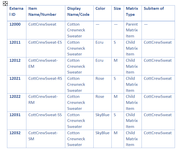 An item matrix, which enables tracking your items by options such as size and color, consists of a parent item and subitems, or children. Each individual combination of matrix options is stored as a separate item record. For example, a parent item record for a sweater could have a list of subitems, with each subitem record representing a different size and color combination.