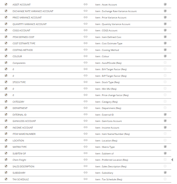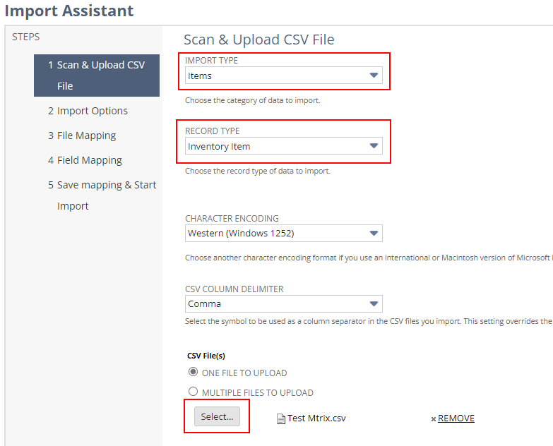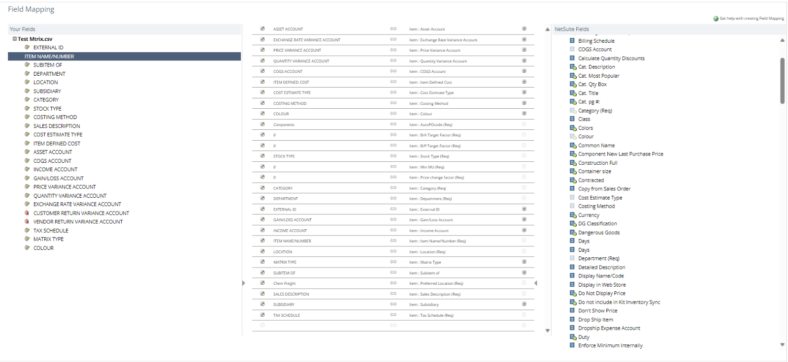 On the Import Assistant Field Mapping page, you need to map CSV file columns to NetSuite fields, so that data is imported into records correctly. For a matrix items import, the key fields that you need to map are:
