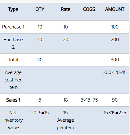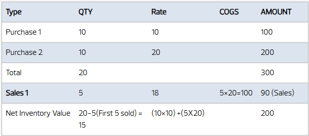 As shown in the above example, the System understood that we sold five quantities from the last purchase, which cost $20 per Item, and the remaining five are left in the warehouse, and ten from the first purchase total inventory value in the warehouse is (10X10=100) + (5X20=100) $200.