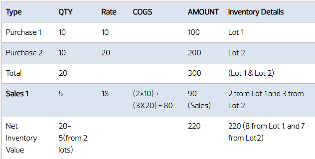 In this example, the system understands that quantity five was sold from Purchase 1. Hence, with 5 (5X10=50) Left from Purchase 1 and 10 (10X20=200) left from Purchase 2, the total inventory value will be 250 in the warehouse.