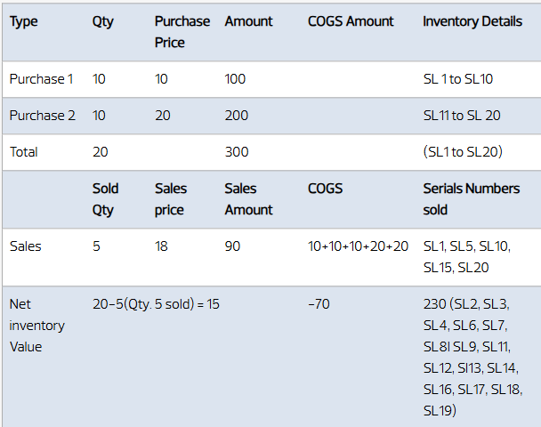 As shown above, the system will consider the cost of the sold item based on the serial number of the items being sold. Here, we are selling serial numbers SL1, SL5, SL10, SL15, and SL20, and their cost respectively 10+10+10+20+20. Total COGS is 70. The inventory value of the remaining serial numbers of items in the warehouse is $230.