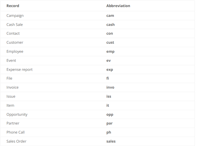 There are actually more abbreviations that may work for you. These are just some of the official default prefixes according to NetSuite’s help documentation. For example, we can use inv to find Inventory Items. But this may also return Invoice results as well, since the abbreviation is ambiguous. Feel free to explore with sensible abbreviations and see what you can find!