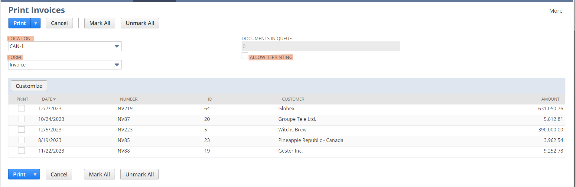 (Optional) To customize the Print Invoices page view and filter the results, click Customize. Use the following subtabs to show the list of fields available on the invoice record.