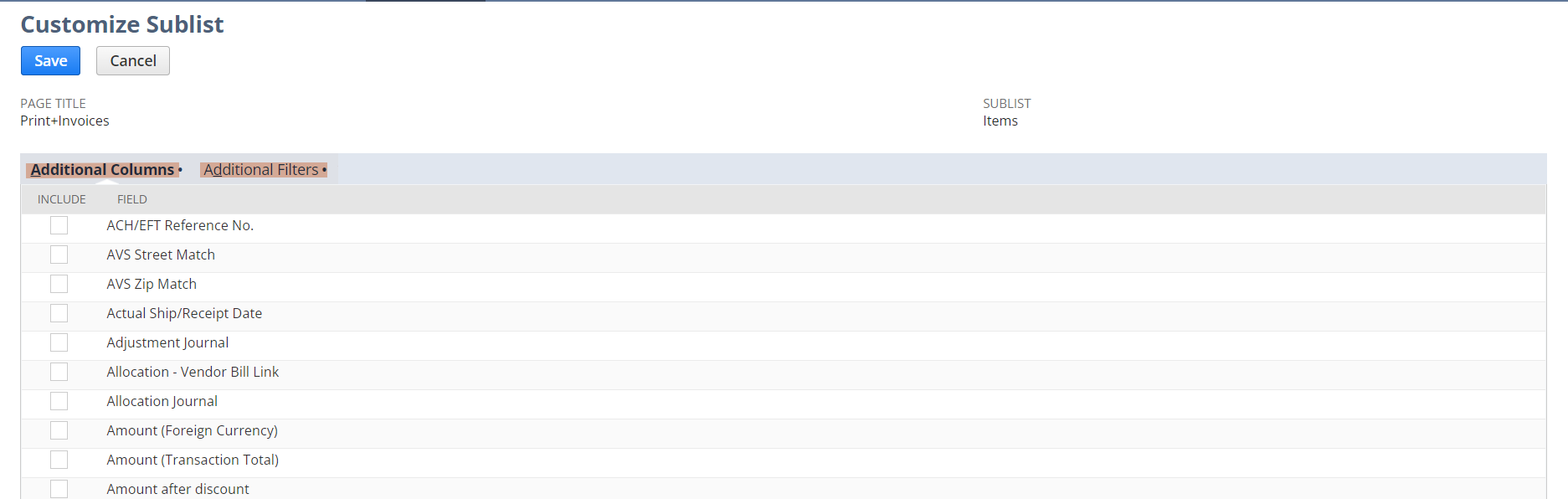 - Additional Columns – To include a field as a column in the sublist, check the Include box for the field, then click Save.